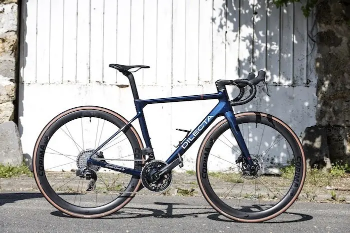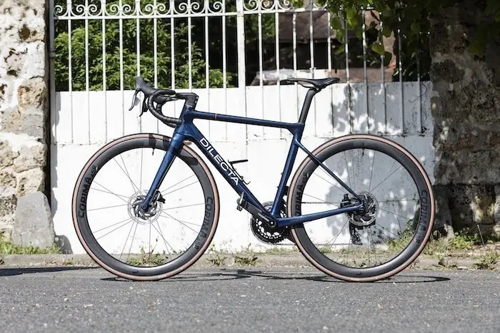Le DILECTA GRAMMONT en bref…Les + : réactivité, polyvalence, confort, design élégant, rapport qualité/prix Cadre : monocoque carbone HM UD finish T700/T800 – Fourche : monocoque carbone – Poste de pilotage : Dilecta carbone – Freins : Sram Force 160/160 mm – Dér. Avant : Sram Force AXS 12 v. – Dér. Arrière : Sram Force 12 v. – Leviers : Sram Force 12 v. – Cassette : Sram Force 12 v. 10-36 – Chaîne : Sram Force 12 v. – Pédalier : Sram Force 12 v. 48-35 – Roues : Corima 45R – Pneus : Hutchinson Blackbird Tubeless 700×28 – Selle : Selle Italia SLR Boost – Tige de selle : Grammont SP – Poids : 7,5 kg en taille S sans pédales – Nombre de tailles : 5 – Prix : 6590 € (kit cadre à 2490 €, avec cockpit à 2850 €) – Plusieurs montages disponibles – Finition : 2 et 3 couleurs (programme Flamme Rouge : 300 €) – Contact : dilectacycles.com