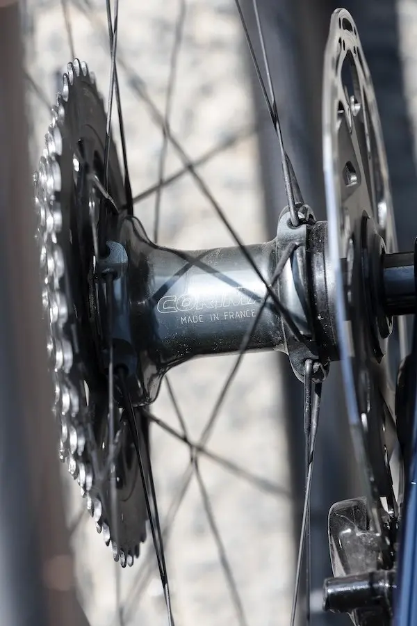 Le kit cadre est disponible en cinq tailles, du XS au XL, avec une géométrie classique privilégiant un équilibre entre stabilité et maniabilité. Compatible avec des pneus jusqu’à 30 mm, le Grammont peut adopter un comportement encore plus confortable, idéal pour s’aventurer sur les pavés des monts des Flandres. Équipé ici de pneus Hutchinson Black Bird tubeless en 28 mm, il filtre efficacement les vibrations tout en restant précis lors des changements d’appui.