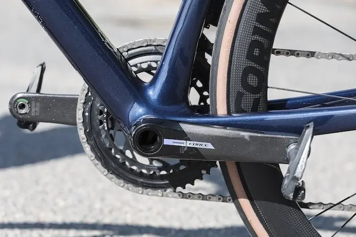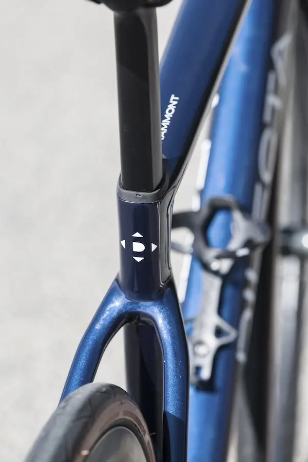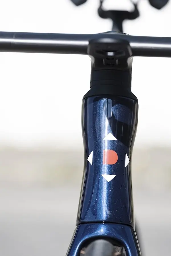 Avec des lignes modernes et épurées, ainsi qu’une intégration totale des câbles, le cadre en fibres de carbone T700/T800 limite son poids à 830 g en taille XS, tout en offrant confort, résistance, durabilité et une certaine élasticité. L’utilisation de fibres à plus haut module (T1000/T1100) aurait permis de gagner quelques dizaines de grammes et d’obtenir un comportement plus rigide, comme les vélos utilisés en World Tour, mais au prix d’un tarif plus élevé et d’un possible éloignement de la philosophie de la marque.