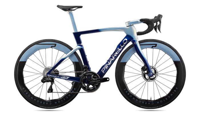 Le design intègre des détails soignés : un logo GPT (Giovanni Pinarello Treviso) sur la fourche en hommage au fondateur, un autocollant commémoratif du 50e anniversaire sur le tube supérieur, et des roues Princeton Wake Wheels peintes sur mesure.
