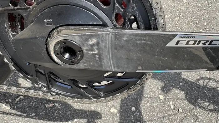 Associé au boîtier de pédalier DUB pour filetage BSA, le pédalier n’a présenté aucun problème de jeu, de craquements ou de manque de fluidité tout au long de ce test. En revanche, comme avec tous les autres pédaliers SRAM, nous avons constaté que la forme des manivelles entrait en conflit avec le talon de la chaussure pour ce qui nous concerne. Rien de grave, mais seulement des dégâts esthétiques qui auraient pu être pire avec des couvre-chaussures d’hiver.