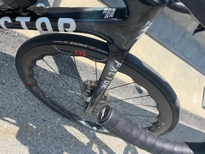 Les rayons carbone, plus rigides et légers (gain de 100 g par paire), apportent réactivité à la relance et filtrent les vibrations mieux que l’acier. Leur montage précis par Loïc assure une fiabilité optimale, offrant une roue vive et stable, idéale pour les cols, descentes rapides ou sprints.