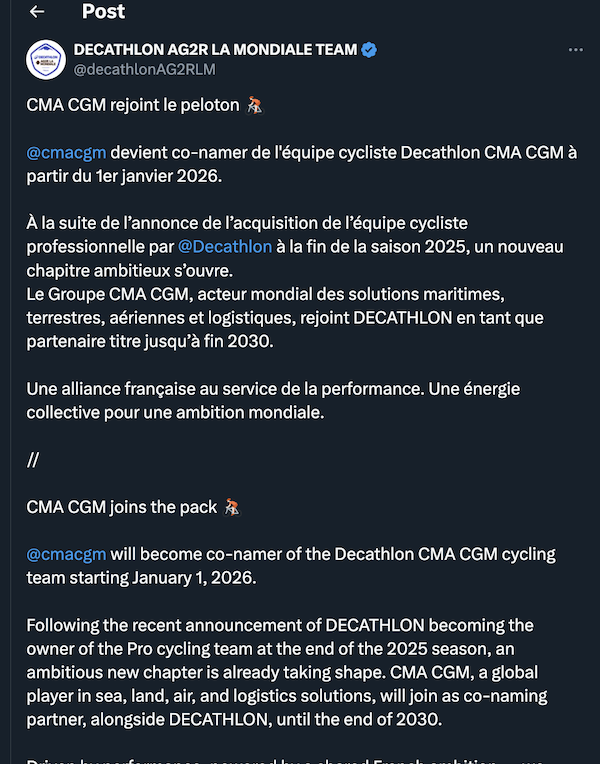 Partager la publication "CMA CGM embarque avec l’équipe Decathlon dès 2026 !"