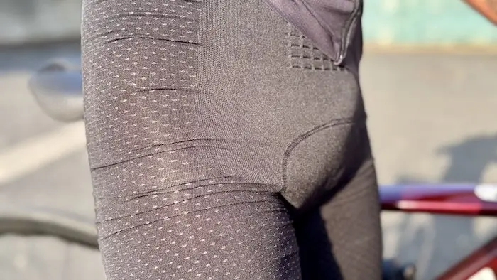 Au niveau des cuisses, le bas du cuissard assure un maintien ferme, mais il se révèle moins restrictif que certains modèles concurrents dotés de bandes en silicone. Sur l’ensemble de la jambe, l’étoffe tissée reste parfaitement en place, sans donner l’impression d’être trop serrée.