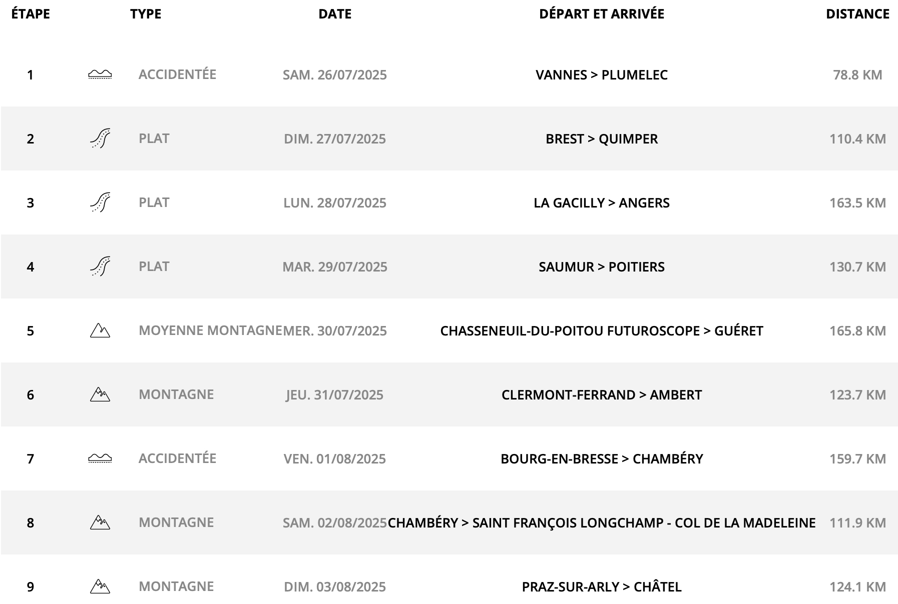 Le Tour de France Femmes avec Zwift 2025 se déroule du samedi 26 juillet au dimanche 3 août, entre Vannes et Châtel. C’est la première fois que l’épreuve se déroule sur neuf jours. Le Grand Départ est donc donné en Bretagne pour lancer le peloton sur un trajet qui met le cap sur les Alpes en passant par le Massif Central. Après le final haletant de l’Alpe d’Huez en juillet 2024, les coureuses ont un rendez-vous crucial lors de l’arrivée au col de la Madeleine, la veille de l’étape finale. Mais l’explication pourrait aussi se poursuivre le dernier jour jusqu’à la station de Châtel, au cœur des Portes du Soleil. Au programme, 1 168 kilomètres et 18 125 m de dénivelé à avaler. Pour bien suivre la course, retrouvez les cartes, profils et cols des étapes ainsi que les horaires de diffusion TV de cette 4e édition du Tour de France Femmes avec Zwift 2025.