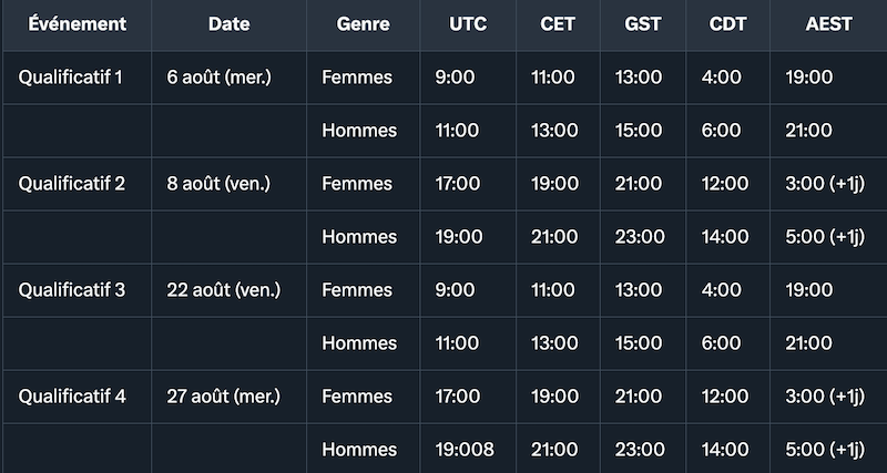 Fuseaux horaires : CET (Heure d’Europe Centrale), GST (Heure du Golfe, +2h/CET), CDT (Heure du Centre US, -7h/CET), AEST (Heure de l’Est Australien, +8h/CET).