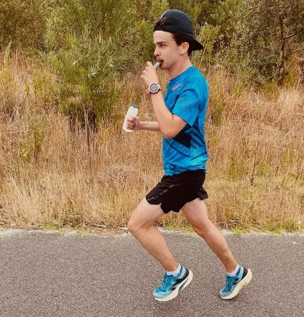 Tiago a donc pris un gel avant chaque départ de séance longue, puis toutes les 30 minutes, même sur des séances de seuil ou des blocs de VMA longue, afin de reproduire les exigences mécaniques de la course. Il a ainsi “entraîné son intestin”, selon les recommandations de spécialistes comme Asker Jeukendrup.