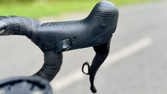 En matière d’ergonomie, Campagnolo a réintroduit le levier au niveau du pouce, avec une forme de poignée légèrement affinée, à mi-chemin entre Shimano et SRAM. Le positionnement des mains est confortable et naturel, bien qu’une période d’adaptation puisse être nécessaire pour maîtriser le système de changement de vitesse ou l’utilisation du bouton supplémentaire situé sur le haut des poignées, vers l’intérieur.