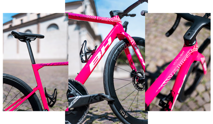 Pour la Vuelta 2025, l’équipe Burgos Burpellet BH présente deux versions du BH Ultralight. La première, avec un design rose audacieux, assure une visibilité dans le peloton tout en incarnant l’esprit combatif de l’équipe. La seconde, sans peinture pour un poids plume de 6,89 kg, est dédiée aux étapes de montagne, mêlant carbone brut et élégance. Les deux vélos partagent un cadre léger, aérodynamique et rigide, intégrant des technologies avancées comme la fourche Air Bow et des câbles intégrés. Équipés de composants Vision, Pirelli et Prologo, ils allient fiabilité et performance. Une vitrine technologique pour briller face aux meilleures équipes mondiales. Contact : bhbikes.com