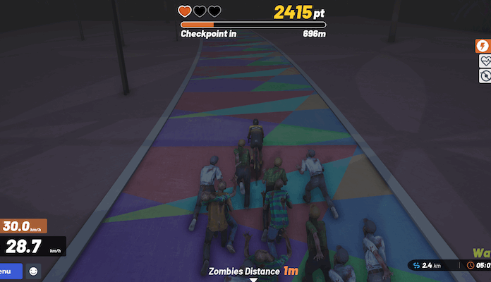 MyWhoosh s’aventure dans la gamification avec le mode arcade. Le premier défi, Zombie Escape, vous plonge dans une course haletante contre des zombies virtuels. Maintenez une vitesse minimale pour ne pas vous faire rattraper, avec trois tentatives avant élimination. Accumulez des points selon la distance parcourue pour débloquer des niveaux plus corsés. Une expérience ludique qui donne un coup de boost à vos entraînements !