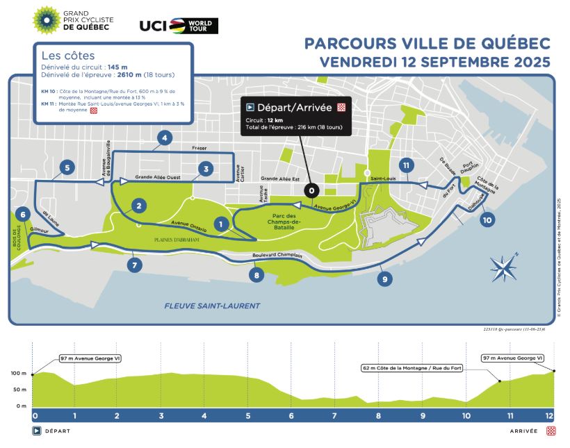 La 14ème édition du Grand Prix Cycliste de Québec se déroule vendredi 12 septembre 2025. L’épreuve propose un circuit revisité, quelque peu raccourci (12 km au lieu de 12,6 km), mais enrichi de deux tours supplémentaires, pour un total de 216 km et 2 610 m de dénivelé positif. Le départ et l’arrivée auront lieu sur les emblématiques plaines d’Abraham, haut lieu du patrimoine québécois. Comme chaque année, ce « nouveau » parcours consacrera forcément un homme fort, plutôt puncheur. Le quadruple vainqueur du Tour de France et actuel champion du monde, Tadej Pogacar, est au départ, tout comme le tenant du titre, Michael Matthews. Sont également présents sur la ligne de départ : Florian Lipowitz, troisième du Tour de France 2025, et quatre vainqueurs d’étape sur la grande boucle, avec Wout van Aert, Simon Yates, Tim Wellens et Jonas Abrahamsen. À un an des Championnats du Monde Route UCI Montréal 2026, la course s’annonce comme une répétition générale grandeur nature. Pour bien suivre l’épreuve québécoise, retrouvez les détails du parcours, la liste des équipes et coureurs engagés ainsi que les horaires de diffusion TV en direct de la course.