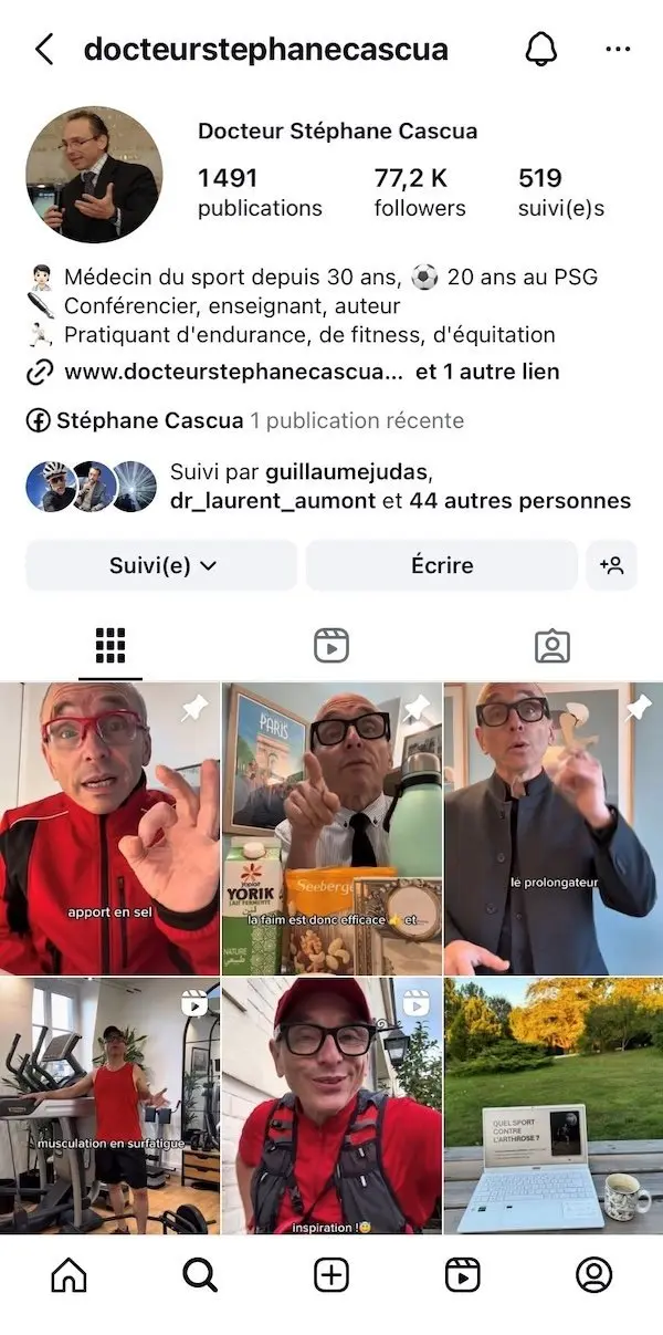 Tout part d’un réflexe : expliquer. « Le patient doit comprendre pour adhérer. Alors j’explique, encore et encore. » Et naturellement, cette pédagogie s’est prolongée sur les réseaux sociaux. Entre deux patients, il enregistre une vidéo, souvent en une prise, avec ce ton drôle et accessible qui fait mouche. Résultat : des dizaines de milliers de followers, et une influence qui dépasse le cabinet. « Je revendique mon statut de médecin du sport qui fait du sport. Avant de dégainer les médicaments, je donne des conseils de terrain. Et les gens adorent. »
