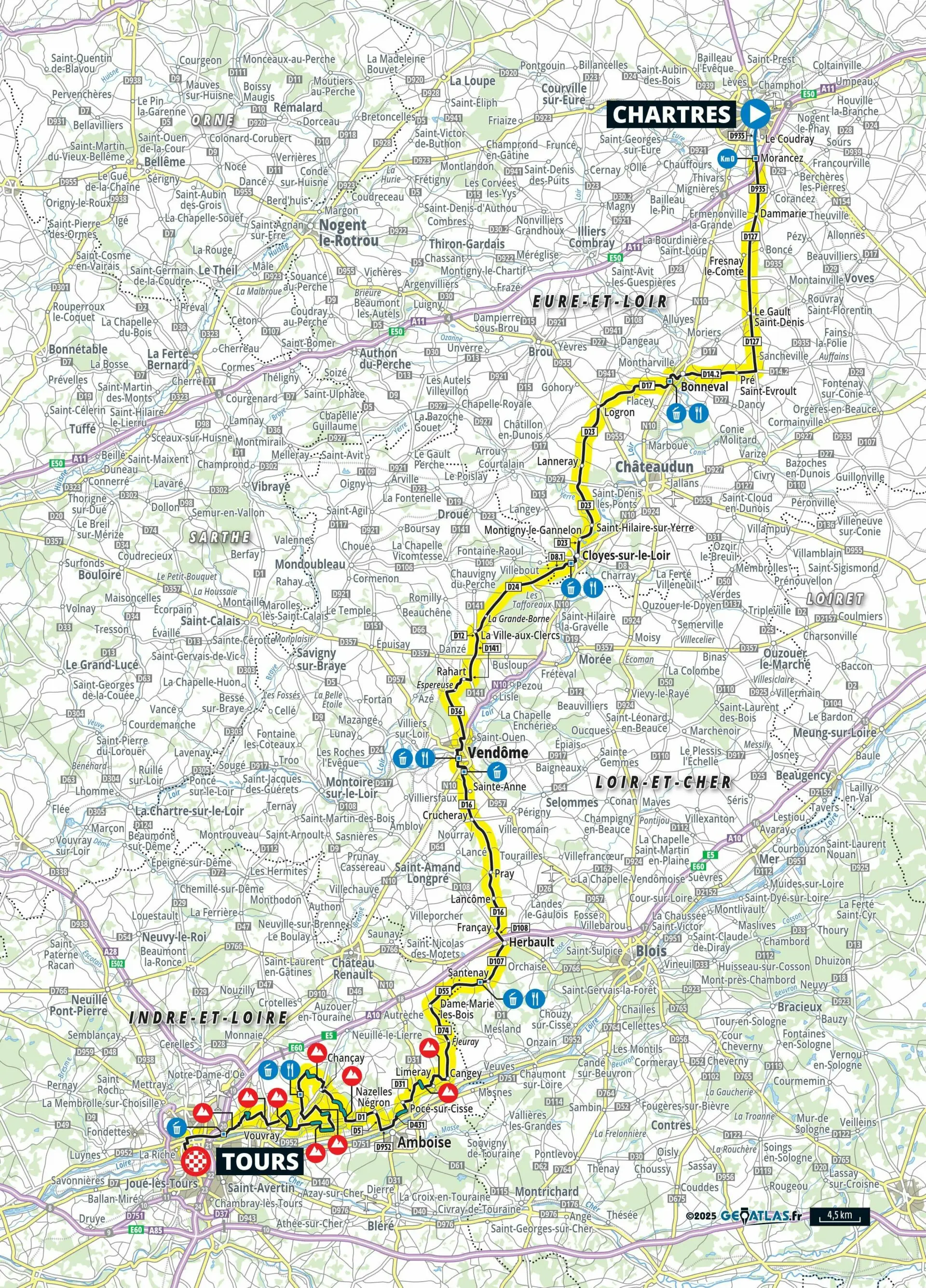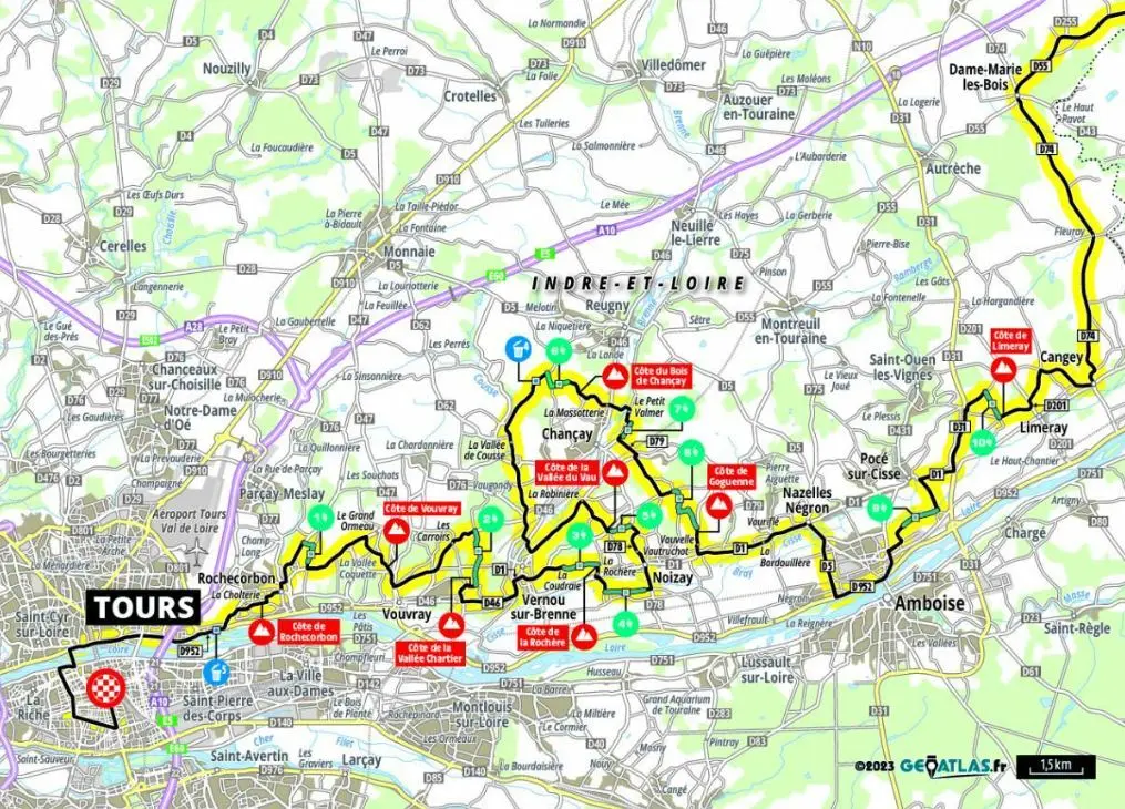 La première portion non asphaltée se présente à 65,4 km de l’arrivée, promettant 800 mètres de boue ou de poussière selon les conditions météo, immédiatement après avoir franchi la côte de Limeray. Au total sur les 211,6 km, neuf ascensions de courte distance pourront être utilisées comme des tremplins, tout comme les 9,5 kilomètres de chemins de vigne répartis sur neuf tronçons. Le dernier d’entre eux se situe avant la côte de Rochecorbon, où les offensives peuvent s’avérer décisives. Cette séquence pourra peser encore plus lourd dans le scénario du final cette année, l’arrivée s’étant rapprochée de deux kilomètres de ce dernier sommet. À l’entrée dans la ville de Tours, le cap est directement mis sur l’hôtel de ville, qui sera désormais approché par le boulevard Béranger, l’arrivée étant jugée au terme d’une ligne droite de 800 mètres similaire en tous points à l’avenue de Grammont.