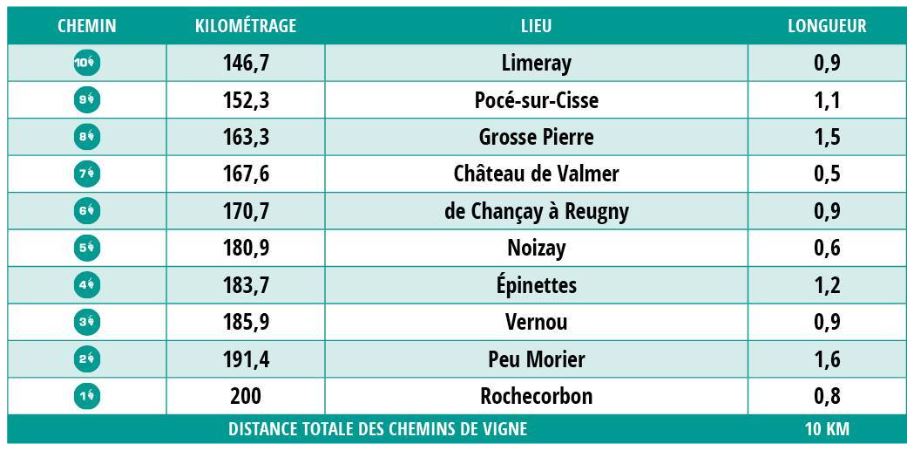La première portion non asphaltée se présente à 65,4 km de l’arrivée, promettant 800 mètres de boue ou de poussière selon les conditions météo, immédiatement après avoir franchi la côte de Limeray. Au total sur les 211,6 km, neuf ascensions de courte distance pourront être utilisées comme des tremplins, tout comme les 9,5 kilomètres de chemins de vigne répartis sur neuf tronçons. Le dernier d’entre eux se situe avant la côte de Rochecorbon, où les offensives peuvent s’avérer décisives. Cette séquence pourra peser encore plus lourd dans le scénario du final cette année, l’arrivée s’étant rapprochée de deux kilomètres de ce dernier sommet. À l’entrée dans la ville de Tours, le cap est directement mis sur l’hôtel de ville, qui sera désormais approché par le boulevard Béranger, l’arrivée étant jugée au terme d’une ligne droite de 800 mètres similaire en tous points à l’avenue de Grammont.