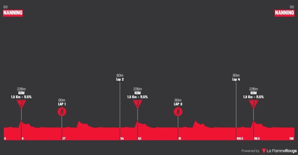Le Tour of Guangxi en Chine, est la dernière épreuve World Tour de la saison 2025. La course débute ce 14 octobre par un circuit de 149 km autour de Fangchenggang, avec trois côtes courtes. Mercredi, l’étape Chongzuo-Jingxi (179 km) inclut une ascension de 2e catégorie. Jeudi et vendredi, les étapes Jingxi-Bama (214 km) et Bama-Jinchengjiang (176 km) comportent respectivement trois et quatre ascensions. Samedi, l’étape Yizhou-Nongla se termine par une montée de 3,2 km à 7,3 %, avec des pentes à 15 %. La course s’achève dimanche à Nanning (134 km) avec un circuit incluant un mur de 1,3 km à 11,5 %. Parmi les favoris, Jhonatan Narvaez et Felix Grossschartner (UAE Emirates-XRG) visent la victoire finale, tandis que Paul Magnier et Jordi Meeus ciblent les étapes. Cian Uijtdebroeks (Visma Lease a Bike) et Mattias Skjelmose (Lidl-Trek) seront aussi au départ.