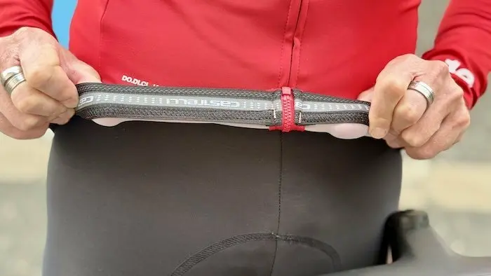 Au cœur de la Do.Di.Ci se trouve la technologie Ristretto, un tissu laminé sans PFAS conçu pour une perméabilité à l’air contrôlée : 3 pieds cubes par minute (environ 85 litres), soit le plus élevé de la gamme Castelli pour 2025. Contrairement aux membranes Gore-Tex ou Polartec, qui plafonnent souvent à 0,7 pied cube/min, le Ristretto agit comme un filtre intelligent : il bloque 99 % du vent tout en autorisant un flux d’air minimal qui aspire la sueur au niveau de la surface cutanée, favorisant l’évaporation sans refroidissement excessif. Cette ingénierie, fruit d’une collaboration avec Ittai, repose sur une structure multicouche très étirable (élasthanne et polyester recyclé) qui offre une élasticité dans les quatre directions pour offrir une coupe anatomique sans contrainte.