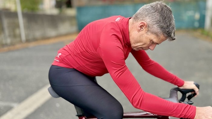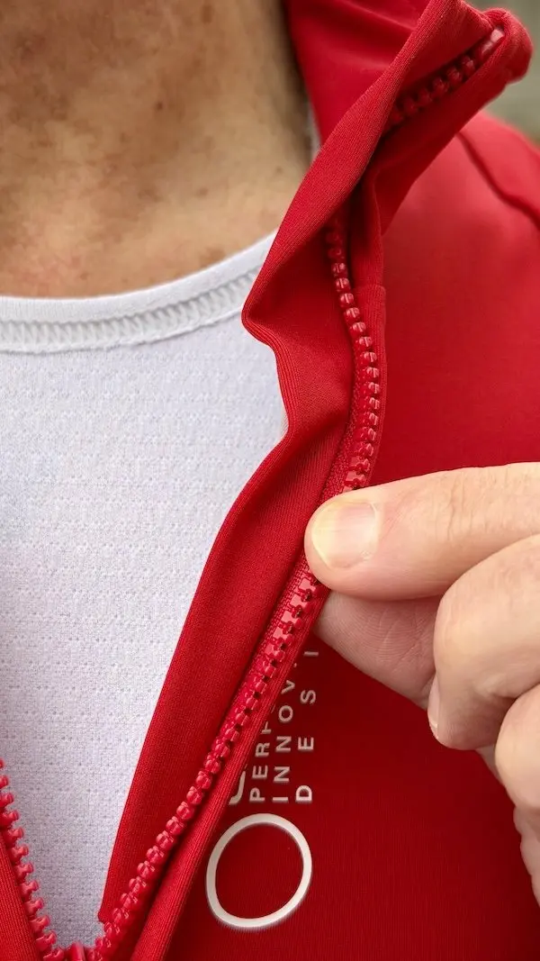 Testée sur plusieurs sorties sous des conditions automnales typiques (10 à 15°C avec un vent moyen mais toujours présent), la Do.Di.Ci a révélé une cohérence exemplaire avec sa fiche technique. L’ajustement près du corps est impitoyable : sans un pli en position aérodynamique, elle épouse le torse comme une seconde peau, éliminant tout battement parasite qui pourrait dissiper des watts précieux. Mais attention aux petits excès de l’intersaison : la veste est bien plus serrée que la dernière Perfetto RoS 3, et pourrait laisser dépasser quelques bourrelets. Si vous avez un doute quant à la proéminence de vos abdos Kronenbourg, vous pouvez sans problème opter par une taille au-dessus de la taille habituelle. Reste qu’au-delà de l’aspect esthétique, la Do.Di.Ci offre une liberté de mouvement fluide pour les changements de position sur le vélo, sans compression thoracique excessive lorsque le rythme s’accélère vraiment et la respiration avec.