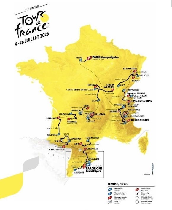 Le parcours du Tour de France 2026 vient d’être dévoilé comme chaque année au Palais des Congrès à Paris. Au programme, 3333 km, 21 étapes et plus de 54 000 m de dénivelé. Après un Grand Départ depuis Barcelone avec un contre-la-montre par équipe le premier jour, les coureurs entameront les choses sérieuses dès la deuxième étape avec une arrivée pour puncheur autour du parc de Montjuich. Les Pyrénées seront abordées dès la troisième étape, mais sans étapes dantesque. En revanche, la course ne réservera aucun temps mort, puisque les coureurs auront à affronter deux étapes difficiles dans le massif Central, avant une rapide transition vers les Vosges, puis les Alpes avec le seul contre-la-montre individuel, avant une dernière semaine qui s’annonce décisive, avec notamment deux arrivées à l’Alpe d’Huez. La 20e et avant-dernière étape devrait se révéler spectaculaire, avec 5600 m de dénivelé sur 171 km. Enfin, la dernière étape entre Thoiry et les Champs-Elysées verra le peloton emprunter trois fois la rue Lepic, comme en 2025, pour un final une nouvelle fois inoubliable. Au total, huit étapes de montagne (dont cinq arrivées au sommet), deux contre-la-montre, six arrivées pour les sprinters et cinq pour les baroudeurs offrent un parcours particulièrement équilibré.