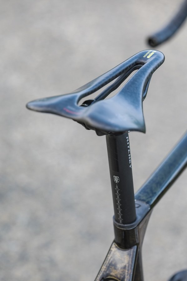 Grâce à l’utilisation d’une fibre de carbone très haut de gamme et ultra-exclusive ainsi qu’à un système de moulage totalement revu, le cadre de l’Axxome RR est annoncé à moins de 750 g en taille M, soit 120 g de moins que l’Axxome GTR, tout en conservant les mêmes lignes classiques et la même géométrie. Une belle performance qui permet d’envisager le montage d’un vélo très léger, comme ici avec notre vélo de test qui bénéficie des meilleures options pour abaisser le poids autour de 6,5 kg complet, soit 300 g en dessous du poids limite du règlement UCI.