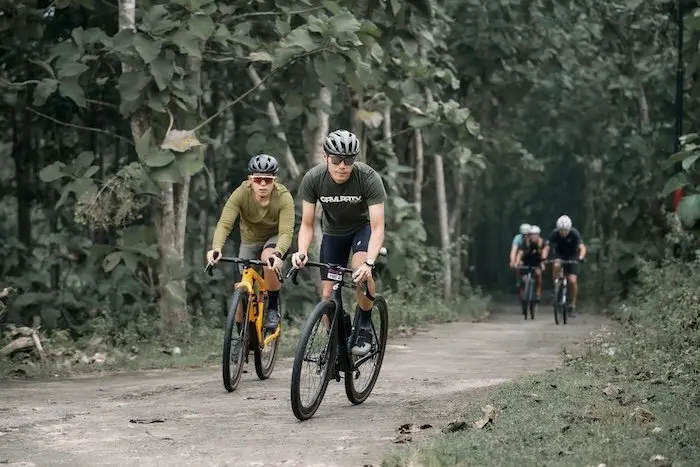- Les vélos de gravel, entre les deux précédemment cités, avec guidon de course mais pneus larges et géométrie endurance pour les chemins tracés et la route