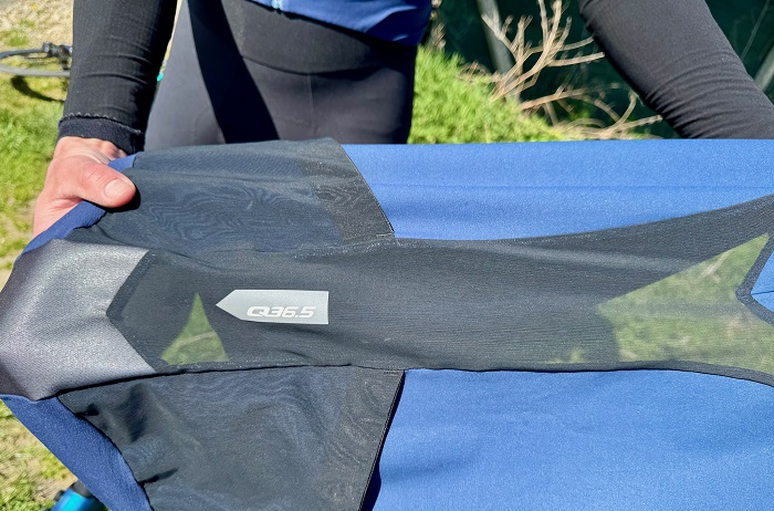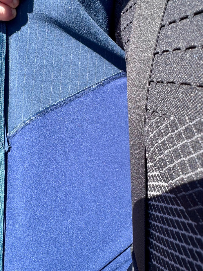 Rappelons que l’ensemble de la tenue testée, dont le maillot, utilise le tissu Hybrid spécifique à Q36.5. Il s’agit là d’un matériau sans membrane coupe-vent à proprement parlé mais dont le but est bien de couper le vent. Par quel « miracle » ? Tout simplement, en utilisant un tissage extrêmement serré, garantissant théoriquement un passage insignifiant du vent à travers le vêtement dans un sens et permettant une meilleure évacuation de la chaleur dans l’autre sens.