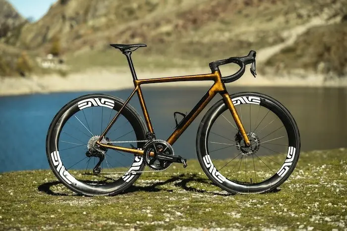 875 g de carbone T1000 peint à la main, 40 mm de dégagement pour les pneus, câbles invisibles, deux géométries au choix : race ou grand tourisme, même ADN de tueur. Confortable comme un fauteuil, nerveux comme un pur-sang : des heures en selle sans souffrance, des bosses avalées sans pitié. Giovanni Monge affirme « C’est le plus beau vélo que j’aie jamais dessiné. Une version 4.0 de l’original, mais en mieux. » Dès 6 990 € sur le configurateur de la marque — chaque exemplaire unique, taillé pour ceux qui roulent loin et gagnent quand même. Contact : officinemattio.com