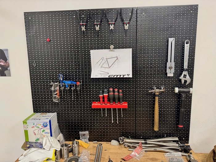 L’histoire de CMT déjà riche de 20 ans, a subi quelques transformations – et une crise sanitaire – qui ont conduit au fonctionnement actuel, toujours avec une équipe réduite et inévitablement une production limitée du fait de l’omniprésence du carbone. Ainsi, si Jean-Pierre Ramoul a racheté la marque en 2022, c’est aujourd’hui Carole qui fait la prise de commande, la relation commerciale, les études posturales ainsi que le montage des vélos, c’est Bastien qui soude (depuis une dizaine d’années en ce qui le concerne) et actuellement Robinson travaille en tant que stagiaire sur le développement d’un cadre VTT prévu pour le courant de l’année 2026.