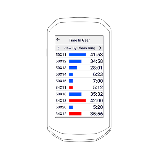 Avec une transmission électronique (Shimano Di2, SRAM AXS, Campagnolo EPS), vous voyez maintenant le temps passé sur chaque combinaison pignon/plateau. Parfait pour optimiser votre stratégie de course ou votre développement.