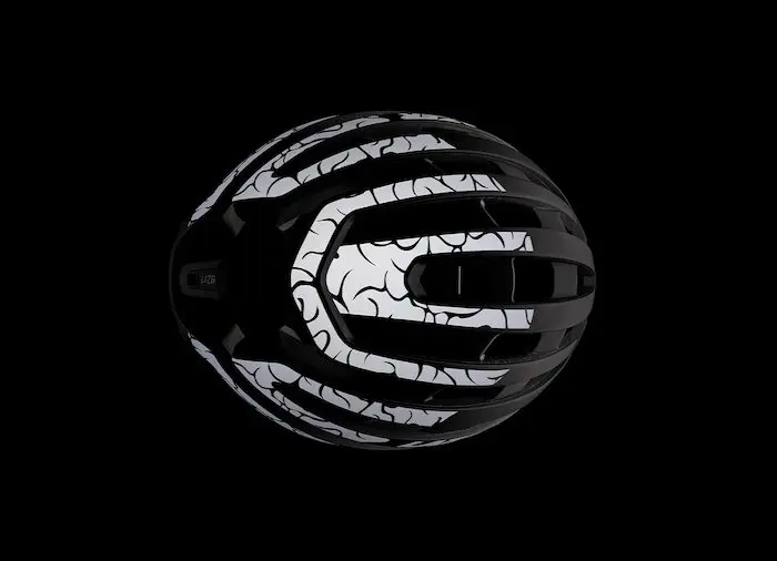 Le casque arbore une finition noir mat sobre et élégante. Un motif cerveau presque invisible est intégré à la coque. De jour, il passe inaperçu. De nuit, sous les phares d’une voiture ou d’un vélo, il s’illumine et révèle un dessin cérébral complet à l’arrière – un clin d’œil lumineux au slogan Use Your Head.