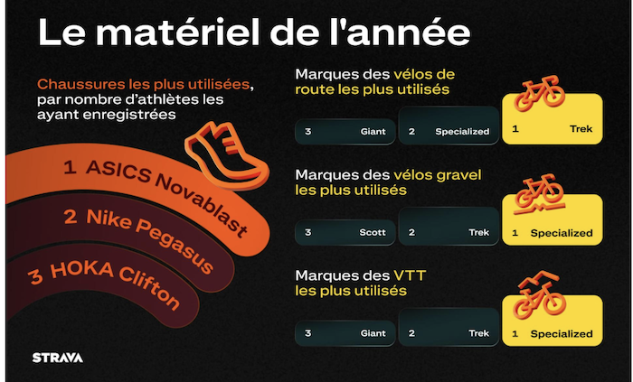 - Vélos de route les plus utilisés : Trek devant Specialized et Giant