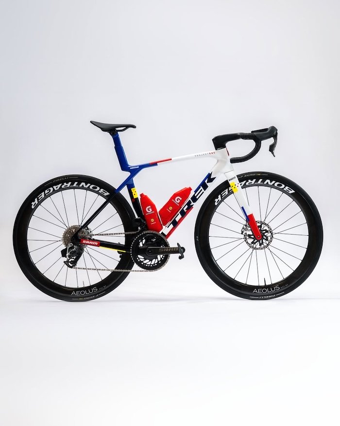 Le Trek Madone reste le vélo utilisé, avec un groupe SRAM Red AXS, des roues Bontrager, et des pneus Pirelli.