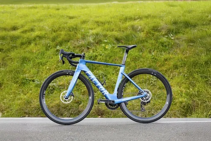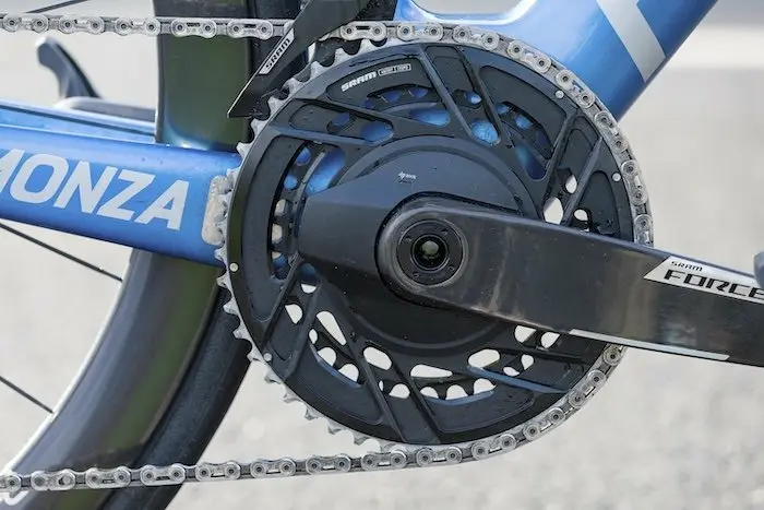 Le modèle testé est équipé du groupe Sram Force AXS, un choix cohérent pour un vélo de ce niveau. Les changements de vitesse électroniques sont nets, précis, et le capteur de puissance intégré rappelle que le Monza reste un vélo taillé pour ceux qui veulent analyser leurs performances aussi sérieusement qu’ils roulent. Les roues proviennent de la gamme Black Inc., avec des jantes de 45 mm de hauteur, ce qui renforce la cohérence d’ensemble : l’aérodynamisme n’est pas traité comme un supplément mais comme un système global.