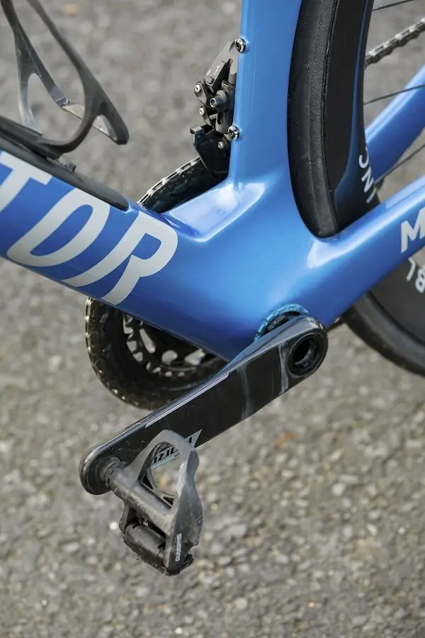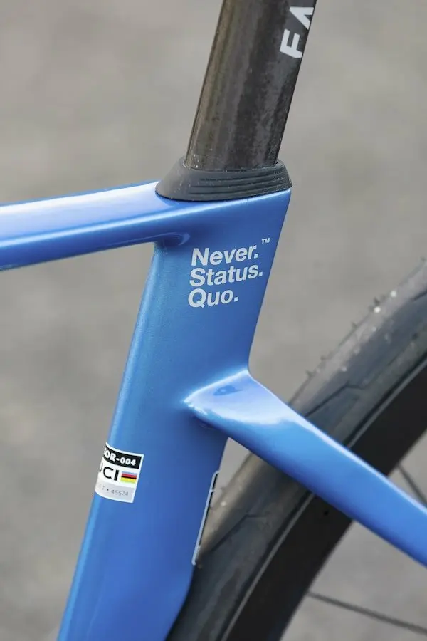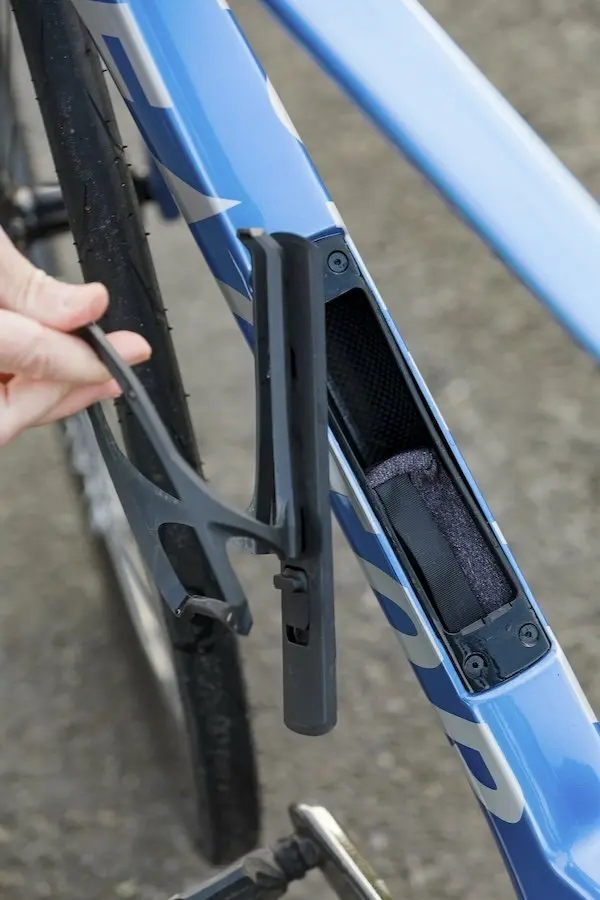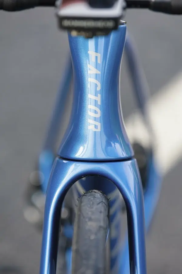 Preuve en est avec le rangement intégré dans le tube diagonal, qui permet d’y placer du petit outillage et un nécessaire de réparation. À cet aspect pratique déjà présent sur certains vélos de gravel ou de type cyclosportif, Factor ajoute un côté performance en précisant qu’il permettrait d’économiser jusqu’à 6 watts à vitesse égale par rapport à une sacoche de selle. Parce que, dans le monde réel, un cycliste même efficace et bien entraîné ne roule pas toujours avec une voiture suiveuse prête à le dépanner en cas de crevaison.