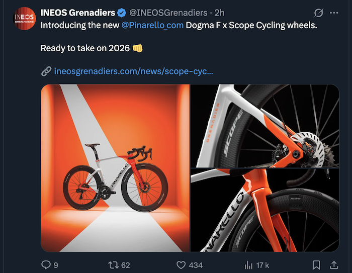 L’équipe INEOS Grenadiers a présenté les couleurs de son vélo Pinarello Dogma F pour 2026, en blanc et orange. L’occasion pour l’équipe WorldTour britannique d’annoncer un changement de partenaire pour les roues, avec l’arrivée de Scope à la place de Shimano. Du côté des transferts, INEOS Grenadiers accueille deux Français, et non des moindres : le champion de France Dorian Godon (Decathlon AG2R) et le dernier vainqueur du Vélo d’Or français Kevin Vauquelin (Arkea B&B Hotels).