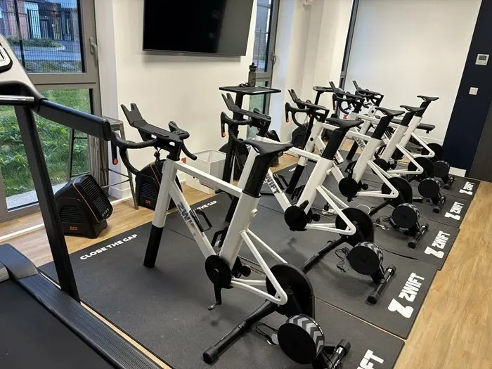 Nous entrons dans la pièce des vélos Zwift. Un espace qui a des allures d’arène moderne : des montures immobiles, prêtes à livrer bataille sans bouger. Comme si l’esprit de compétition avait trouvé une manière d’habiter les murs même quand il pleut dehors. Étienne parle de “battle”, et soudain le mot prend un sens étrange et joyeux : la guerre, ici, se fait à coups de watts et de sueur, pour le plaisir de se tirer vers le haut.