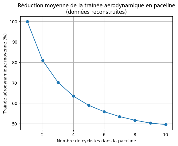 À mesure que la file s’allonge, les effets deviennent de plus en plus marqués. Les coureurs placés au milieu du groupe roulent dans des conditions aérodynamiques extrêmement favorables, parfois avec une traînée réduite de 40 à 50 % par rapport à un cycliste isolé. Plus encore, la traînée moyenne du groupe baisse continuellement à chaque nouveau coureur ajouté. Avec huit ou neuf cyclistes, l’effort aérodynamique moyen est presque divisé par deux.