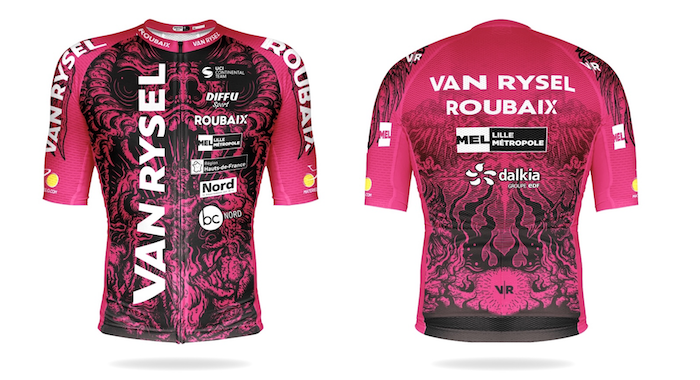 Conçu par Van Rysel en collaboration avec le créateur roubaisien Brian Marie-Claire (Collectif Machine Infernale) et réalisé par Diffusport (partenaire textile historique de l’équipe), le nouveau kit est un véritable manifeste visuel.