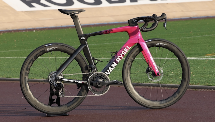 En 2026, tous les coureurs évolueront sur le RCR-F, un pur vélo de vitesse dont le design claque : rose iconique de Roubaix à l’avant, carbone brut exposé à l’arrière. L’esthétique est à la fois audacieuse et parfaitement cohérente avec le nouveau maillot. Les vélos sont équipés d’un groupe SRAM Force AXS et de roues Zipp 454.