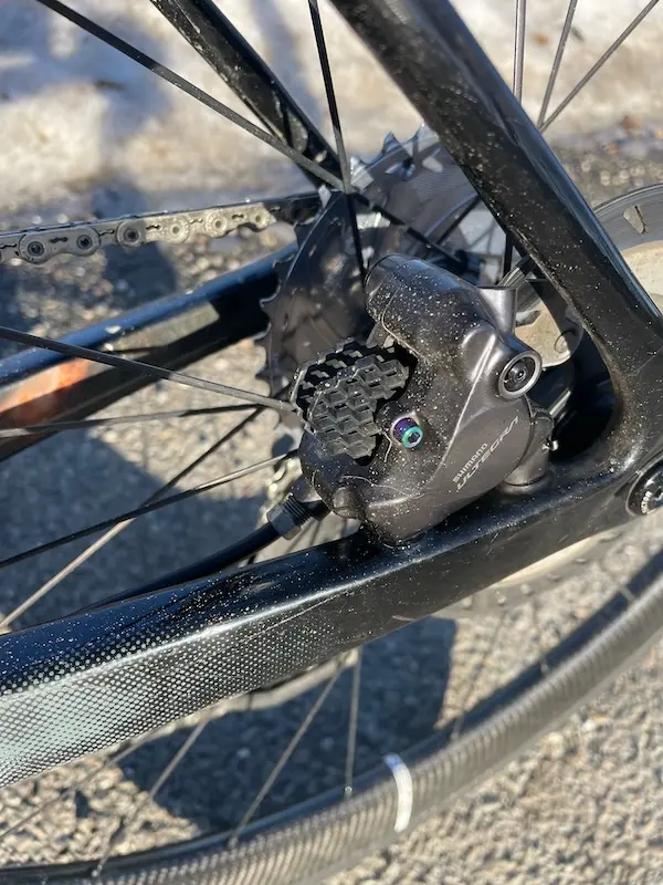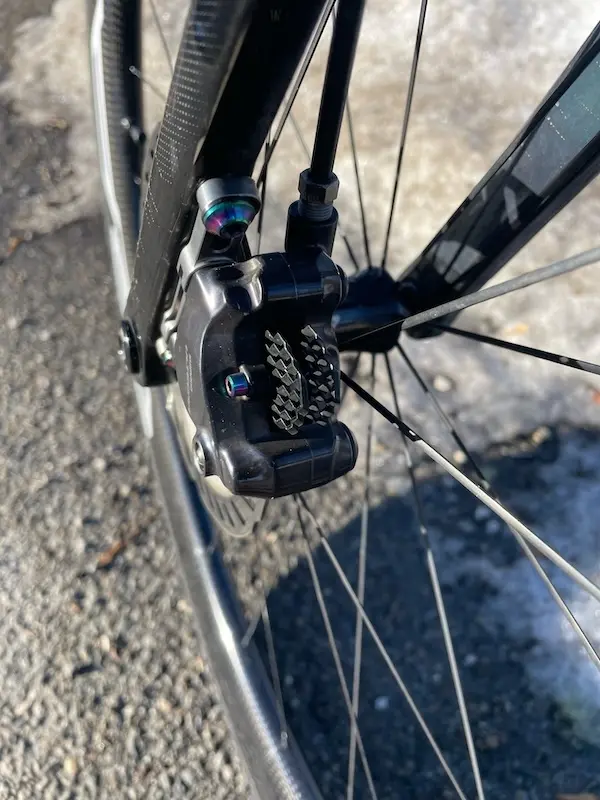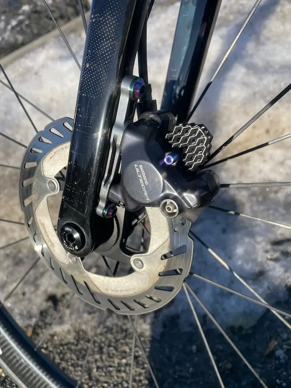 La visserie est souvent sous-estimée dans l’optimisation d’un vélo. Les boulons Flat Mount en titane remplacent les vis acier d’origine par une solution plus légère, résistante à la corrosion et visuellement plus qualitative. Montées sur un groupe Shimano Ultegra avec des plaquettes Absoluteblack, elles apportent une touche unique au vélo.