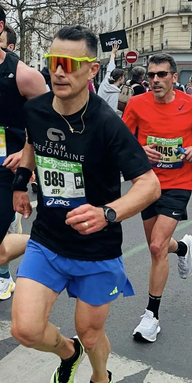Stéphane n’a pas le luxe de “son” parcours, de “son” café, de “ses” routes. Il doit s’entraîner là où il se trouve. Une semaine en Allemagne, la suivante aux États-Unis, puis à Singapour ou à Dubaï. Et c’est précisément cette contrainte qui l’a rendu plus adaptable que la plupart d’entre nous. Pas de rituel figé, pas de matériel sacralisé, pas de routine immuable : il fait avec ce qu’il a, là où il est.