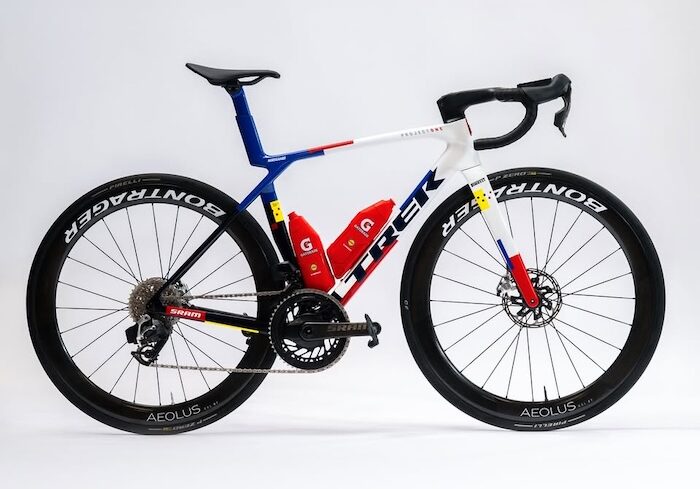 Stabilité et efficacité pour les vélos Trek de Lidl-Trek en 2026. L’équipe s’appuie sur le Madone 8 SLR 9 pour les épreuves en ligne, tandis que le Speed Concept reste dédié aux contre-la-montre. Les vélos sont équipés des groupes SRAM Red AXS avec capteurs de puissance Quarq, associés aux roues Bontrager Aeolus RSL et aux pneumatiques Pirelli. Lidl-Trek conserve une configuration 100 % maison pour de nombreux composants, avec les selles Bontrager, le poste de pilotage Trek Aero RSL Road et les porte-bidons spécifiques au Madone, complétés par des pédales Shimano (sans marquage) et des compteurs Wahoo.