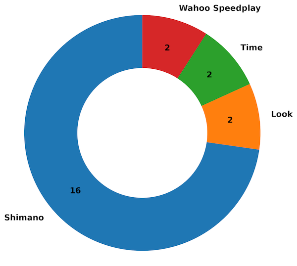 La saison 2026 montre une nette domination de Shimano dans le domaine des pédales, avec pas moins de 16 équipes. Fait intéressant, certaines de ces équipes utilisent des pédales Shimano hors marquage, en dehors de tout contrat officiel, notamment celles qui ont choisi des groupes SRAM : un moyen de profiter de la fiabilité reconnue de Shimano tout en respectant leurs partenariats principaux.