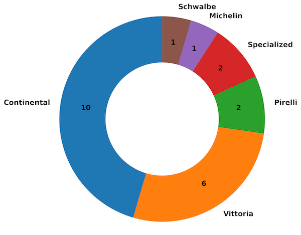 La saison 2026 confirme la domination de Continental, avec 10 équipes, mais voit également une forte présence de Vittoria avec six équipes. Pirelli et Specialized restent minoritaires mais solides avec deux équipes chacune, tandis que Michelin et Schwalbe font leur apparition avec une équipe seulement.