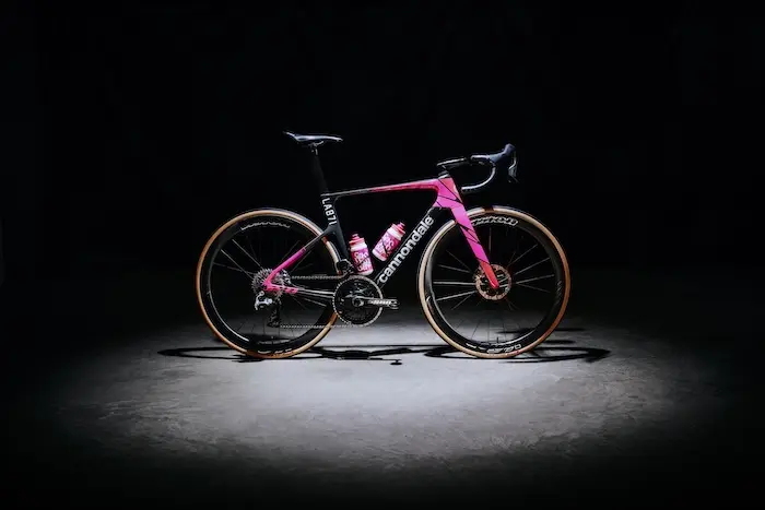 Changement technique important pour les Cannondale d’EF Education Easy First en 2026 avec le passage des transmissions Shimano aux groupes SRAM Red AXS. Les coureurs s’appuient toujours sur le SuperSix Evo Lab71 pour les épreuves en ligne, tandis que le SuperSlice reste dédié aux contre-la-montre, le tout associé aux capteurs de puissance Quarq. L’équipe conserve en revanche une forte continuité sur le reste de l’équipement, avec les roues Vision Metron, les pneumatiques Vittoria, les selles Fizik, le poste de pilotage Cannondale SystemBar R-One, les pédales Wahoo Speedplay, les compteurs Wahoo et les porte-bidons Elite.