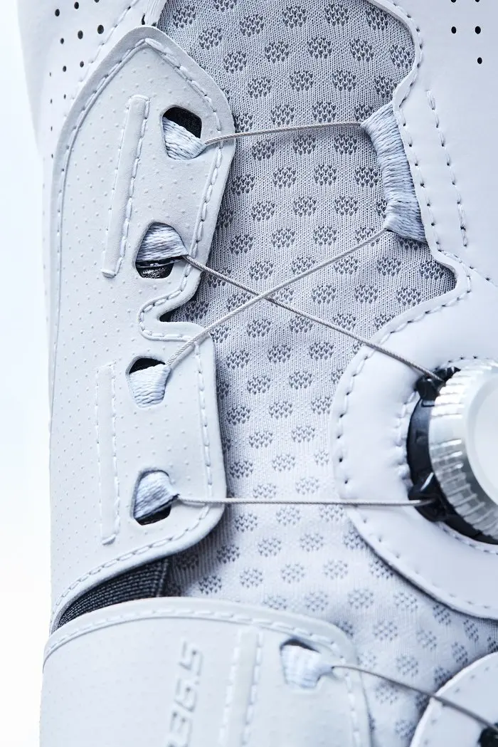 Dans un second temps, le confort lors de l’essayage est bien sûr attendu : ici le contact global est très agréable. Comme une tendance générale – les dernières Specialized S-Works Ares 2 l’ayant portée à un niveau élevé -, les Unique Pro ont également élargi la zone métatarsienne, à l’avant de la chaussure. Même par des températures déjà élevées (toutefois légèrement en dessous de 30°C sur la durée du test), et malgré la semelle en carbone qui se prolonge sur les côtés, les pieds n’ont jamais gonflé au point de provoquer des frottements ou une gêne. A ce sujet, Q36.5 s’attache à garantir une stabilité thermique optimale pour tous ses produits, qu’il s’agisse de maillots, de chaussettes ou de chaussures. De larges aérations à l’avant de la semelle et des aérations latérales à l’intérieur de la tige concourent à ces bonnes sensations. Et surtout, la partie centrale en mesh très exposée joue un rôle prépondérant en gérant parfaitement l’aspect ventilation. C’est un réel point fort par rapport à autres chaussures du marché qui sont systématiquement plus « fermées ».