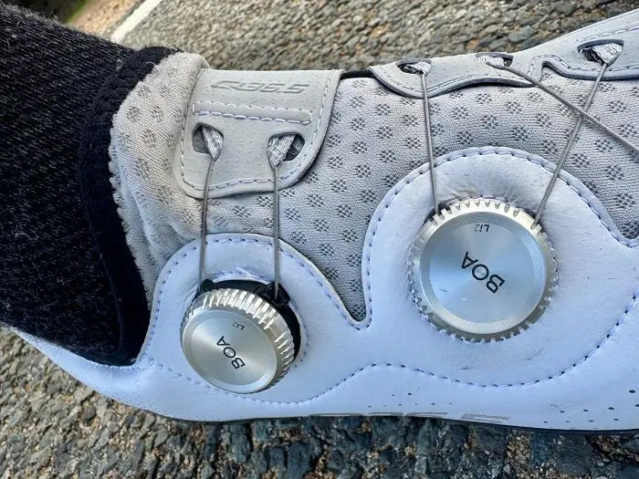 Du fait de la forme de mon pied, quand le rendement maximal est demandé, il a tout de même été nécessaire de serrer les Boa au maximum. Cela n’a pas occasionné de gêne en particulier, ce qui est plutôt rare en ce qui me concerne. Cela tient peut-être à l’absence de languette et à l’utilisation d’une véritable semelle intérieure. Ainsi, aucune matière rigide ne se chevauche et la tige épouse parfaitement la forme du pied. Cependant, dans ces conditions la partie en mesh est mise à contribution et il y a quelques plis à ce niveau, indiquant que la matière est « poussée à son maximum ».
