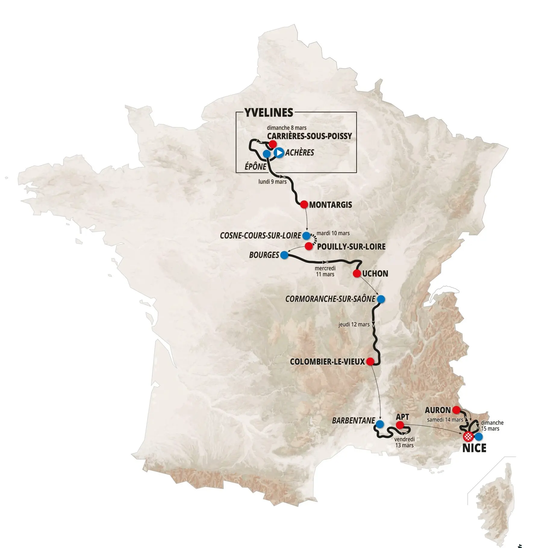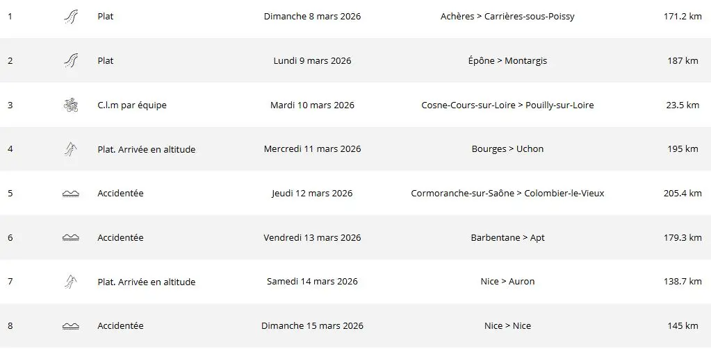 Le parcours de Paris-Nice 2026 en un clin d’oeil