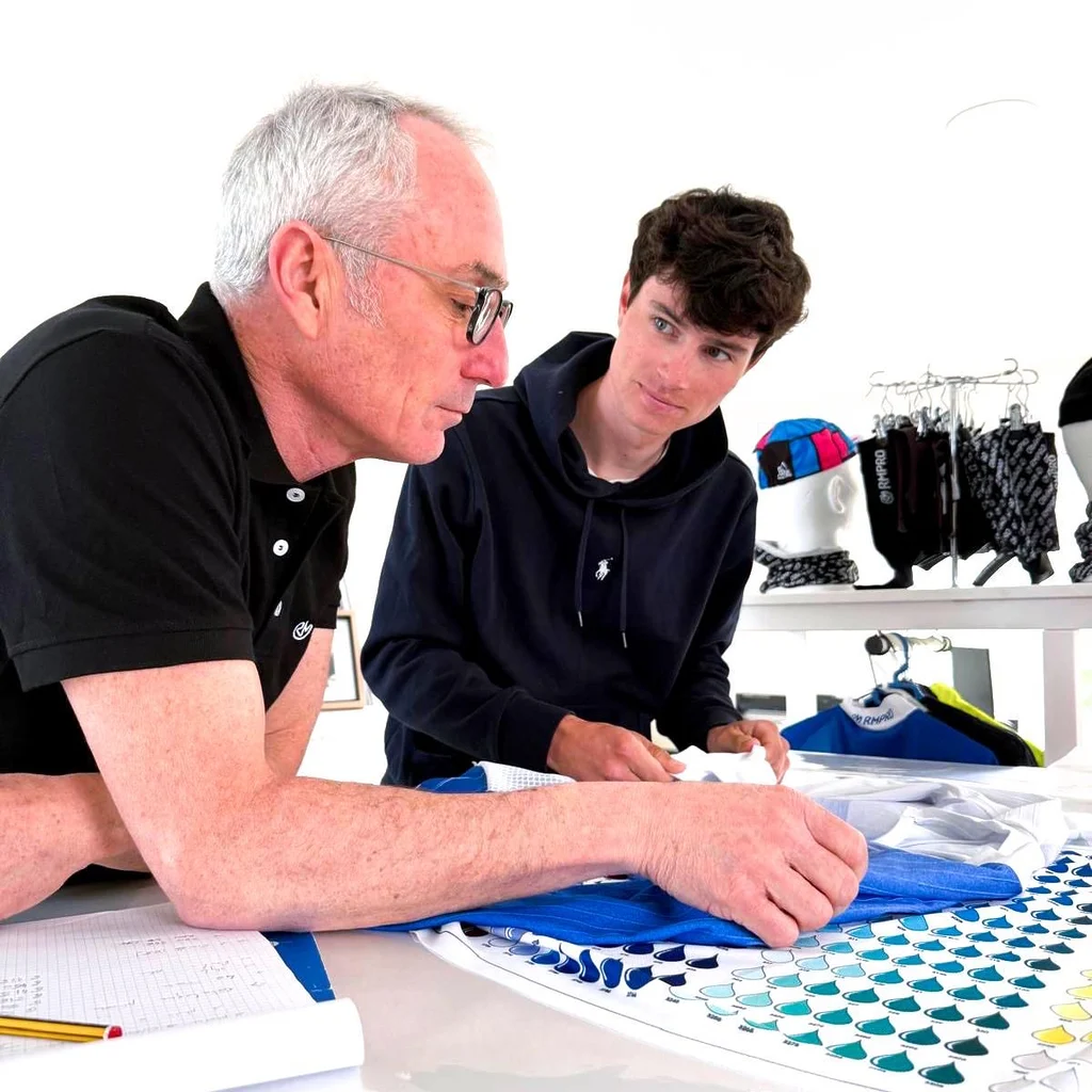 C’est là que l’histoire prend une dimension familiale. Car Clément Guilbert n’est pas seulement le fils de Charles. Il est aussi coureur cycliste. Et il travaille désormais dans l’entreprise. Comme souvent dans ces histoires, tout commence naturellement. Un peu par mimétisme. « J’ai grandi là-dedans. J’aimais le vélo… et aussi les vêtements. » Petit à petit, Clément se met à apprendre le graphisme. À dessiner. À concevoir des maillots. Aujourd’hui, il participe à de nombreux aspects de l’entreprise : graphisme, développement produit, relation avec les équipes. Et continue en parallèle sa carrière de coureur. Une double vie rendue possible par le rythme particulier du cyclisme. « Le rush de l’entreprise est surtout l’hiver. Et l’hiver je ne cours pas. Donc je travaille plus au bureau. »