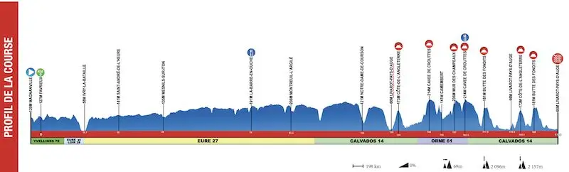 Paris-Camembert 2026 se dispute ce mardi 31 mars, et propose un parcours de 198 km entre Magnanville (Yvelines) et Livarot-Pays-d’Auge (Calvados), fidèle à sa tradition. L’épreuve se découpe en deux temps : une longue première partie sans difficulté majeure, propice à la mise en route et au contrôle de la course, avant un final nettement plus exigeant au cœur du Pays d’Auge. Avec près de 2 200 m de dénivelé positif, les 60 à 70 derniers km concentrent l’essentiel des difficultés, avec une succession de côtes courtes mais pentues. Parmi les points clés du final figurent la Côte de l’Angleterre, la Cavée de Crouttes et surtout le redoutable Mur des Champeaux, premier juge de paix. La répétition de la Butte des Fondits, dont le dernier passage intervient à seulement 9 km de l’arrivée, devrait favoriser les offensives tardives et offrir un terrain idéal aux puncheurs désireux d’éviter un sprint. Retrouvez le parcours, les horaires de passage, ainsi que la liste des engagés de ce 87e Paris-Camembert.