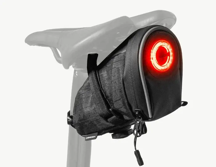 Compacte mais étonnamment logeable, la sacoche de selle Saddle Bag with Light s’impose comme l’accessoire idéal pour les cyclistes dont le feu arrière est absent… ou simplement masqué par une sacoche classique.